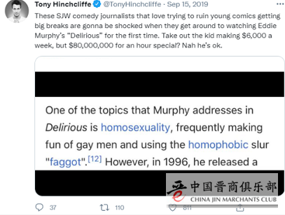 他还拿美国黑人喜剧演员艾迪·墨菲(Eddie Murphy,曾为迪士尼动画片《花木兰》“木须”一角配音)早年的恐同笑话举例,称那些“社会正义战士”记者只会大惊小怪。