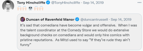 他继而转发就职的《喜剧商店》的前经纪人推特以示“清白”,后者称:“可悲的是,喜剧人已经变得粗俗无礼了……《喜剧商店》都会做广泛的背景调查,我们只雇佣名声没问题的喜剧演员,就像Mitzi常说的‘如果他们很粗鲁,他们就不好笑’。”