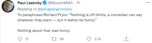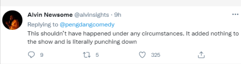 “用理查德 · 普赖尔(美国著名喜剧演员)的话来说: ‘没什么是禁止的,喜剧演员可以说任何他们想说的话,但最好是有趣的。’可是这个(视频),一点都不好笑。”