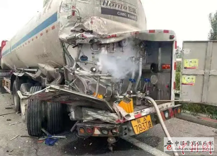 事故发生在二广高速公路797公里路段(太原往长治方向),液氧罐车被后方一辆满载煤粉的半挂车追尾,罐体后方管道遭挤压破损,导致液氧泄漏,幸未造成人员伤亡。