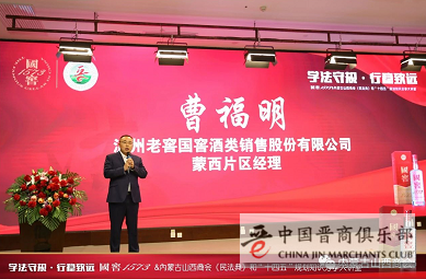 泸州老窖国窖酒类销售股份有限公司蒙西片区经理曹福明作了发言,他感谢各位参会人员百忙之中抽出时间参加此次活动,感谢内蒙古山西商会与国窖1573联合举办的此次分享大讲堂活动,感谢两位主讲老师为活动进行讲座,使更多的企业了解法律知识,了解泸州老窖。