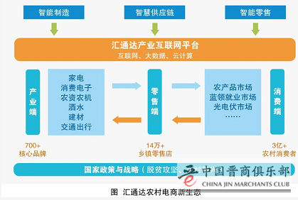 汇通达通过会员制形式整合农村产业链的供应端和零售端资源,为乡镇零售店提供商品和物流服务。