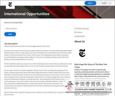 《纽约时报》招聘驻俄记者广告(截自该报社网站)