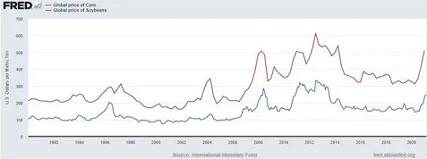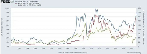 但是统计上的解释依然不能掩盖当前几乎所有大宗商品价格都在飞涨以及各种商品的运费也处在历史高位这些现实,从下图中的铜、铁矿石、玉米、大豆、原油等等价格走势可以看出,除了原油之外,今天主要大宗商品的价格基本都快接近2011-2012年间的高点了。