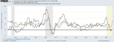 恰恰相反,美国拜登政府正在准备通过新的跨度数年、总额3万多亿美元的财政刺激计划。欧洲2020年通过的财政刺激计划也正准备在未来几年内花掉几万亿欧元。而欧美的中央银行都表露出了对于通货膨胀的高容忍态度。