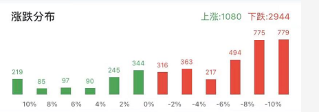 目前市场空方主导。UAlCoin数据显示,截至记者发稿前,全市场主要虚拟币上涨数量为1080个,而下跌数量达2944个,接近上涨数量的3倍。涨幅超过10%的币种为219个,下跌幅度超过10%的币种数量达779个。