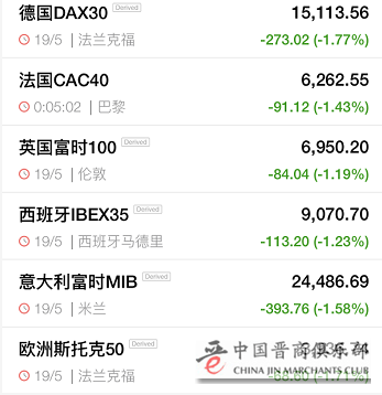 欧洲股市同样遭遇大跌,主要股指普遍跌超1%,泛欧股指和英法意西股指均创4月20日以来最大跌幅,德国股指更是创1月27日以来最大收盘跌幅。