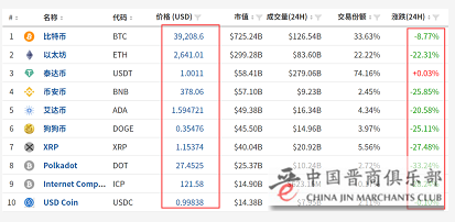 不过,之后加密货币市场反攻,跌幅缩小,截至发稿,比特币价格反弹至3.9万美元左右,24小时跌幅缩小至8%;以太坊价格为2640美元,跌幅缩小到22%;狗狗币也重回0.3美元之上。