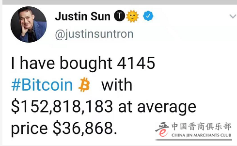5月20日,加密货币平台Tron创始人孙宇晨在比特币价格大跌之际抄底买入。他通过社交媒体称自己以1.53亿美元大举买入,总共购买了4145枚比特币,均价为36868美元。