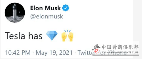 另外,在市场暴跌之际,特斯拉CEO马斯克在个人社交媒体账号上发布了“特斯拉有钻石手(Diamond Hand)”的消息。按通常的意思,有“钻石手”的意思是不畏市场波动,持有仓位直到目标。市场观点将其解读为特斯拉不会抛售手中已有的比特币。