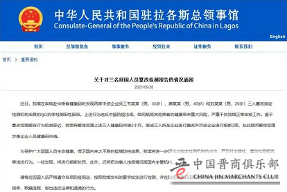 5月20日,中国驻拉各斯总领馆网站发布关于对三名回国人员篡改检测报告的情况通报。
