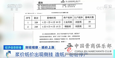 全国工商联纸业商会秘书长 张慎金:停机的原因是受纸浆原料价格上涨,造成浆价和纸价的倒挂,这样有些纸厂没有办法,就要停机了。