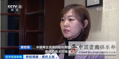 中国再生资源回收利用协会废纸分会秘书长 唐艳菊:促使区域的这些具体的龙头回收企业,发挥它的规模优势,去稳定现在的末端生产企业的原料和市场的价格,国内废纸的质量、回收量也会有大幅提升。