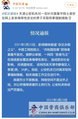 22日20时许,据@平安天津,天津公安机关对一名针对袁隆平院士逝世在网上发表侮辱性言论的男子采取刑事强制措施。