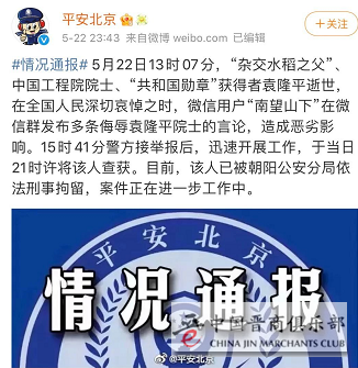 22日23时许,据@平安北京,5月22日13时07分,“杂交水稻之父”、中国工程院院士、“共和国勋章”获得者袁隆平逝世,在全国人民深切哀悼之时,微信用户“南望山下”在微信群发布多条侮辱袁隆平院士的言论,造成恶劣影响。15时41分警方接举报后,迅速开展工作,于当日21时许将该人查获。目前,该人已被朝阳公安分局依法刑事拘留,案件正在进一步工作中。