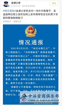 23日11时许,据@金湖公安消息,江苏省金湖县公安机关对一名针对袁隆平、吴孟超两位院士逝世在网上发布侮辱性言论的男子采取刑事强制措施。