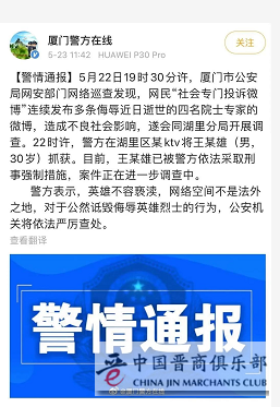 5月22日19时30分许,厦门市公安局网安部门网络巡查发现,网民“社会专门投诉微博”连续发布多条侮辱近日逝世的四名院士专家的微博,造成不良社会影响,遂会同湖里分局开展调查。22时许,警方在湖里区某ktv将王某雄(男,30岁)抓获。目前,王某雄已被警方依法采取刑事强制措施,案件正在进一步调查中。