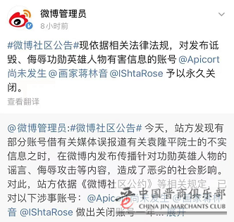 23日12时许,@微博管理员 称,现依据相关法律法规,对发布诋毁、侮辱功勋英雄人物有害信息的账号@Apicort尚未发生@画家蒋林音@IShtaRose 予以永久关闭。