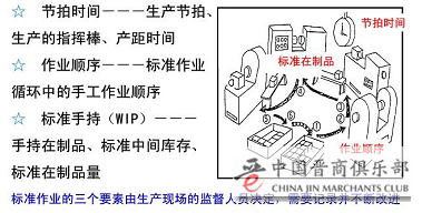 2.标准作业前提是Cell生产方式,包含多能工作业、走动式作业,建立以人为中心,去掉浪费,只集中了真正意义上的工作,可以重复在相同条件下进行作业的顺序,同时时间、机械的配置等也配合其上述模式。下面我们将看到,丰田所说的标准化作业不像我们企业里面的标准化作业—有作业步骤、时间、来料、作业注意事项,它的基础是Cell、多能工作业、走动式作业,不理解这点就根本理解不了下面说的标准化作业的要素工具—三个要素和四张表。