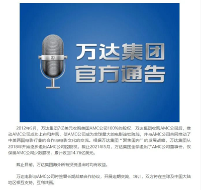 5月23日,万达集团在官网发出公告,公司清仓式减持AMC,且全部退出了AMC公司董事会。
