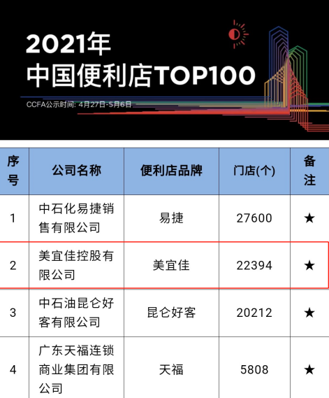 4月底,中国连锁经营协会发布“2021中国便利店TOP100榜单”,榜单显示,门店数量超2万家的企业共3家,其中中石化的易捷以27600家蝉联榜首,美宜佳以22394的门店数量位列第二,中石油的昆仑好客紧随其后。纵观全国,并未出现真正意义上的全国性连锁品牌,唯有断层式的区域龙头企业,整体行业仍呈现群雄割据的局面,但从门店增速和便利店重新发力的赛道来看,未来出现全国性连锁品牌的可能性依旧存在。