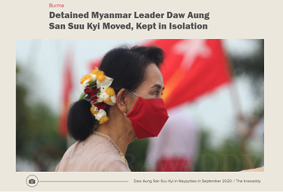 另一名律师钦貌梭(Khin Maung Zaw)则于25日告诉The Irrawaddy,在短暂出席听证会后,昂山素季被转移至另外一个“未知地点”。在此之前,她一直被“软禁”在内比都的一处住所。