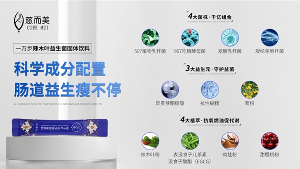 4大菌株,千亿组合:包含美国硅谷国际发明奖获奖成分——507植物乳杆菌;最强吃糖菌种——TCI907吃糖酵母;母乳同款菌株——发酵乳杆菌;自带防护罩的凝结芽孢杆菌。