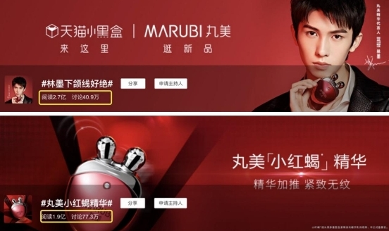 截至5月24日,微博#林墨下颌线好绝#话题阅读量超2.7亿,讨论量达40万+,而#丸美小红蝎精华#话题的阅读量超过1.9亿,讨论量达77万+。