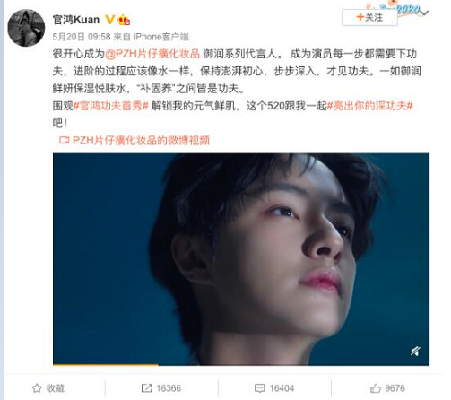 从前期的悬念预热到正式官宣日,再到5月20日片仔癀化妆品与官鸿共同打造的首支功夫TVC释出,片仔癀化妆品此次代言人官宣在微博平台引起不少讨论,美妆类、生活方式类、娱乐类等多元领域KOL以及众多KOC均纷纷发布元气满满的内容进行热议。520当天,与此相关的#官鸿功夫首秀#话题更是微博登上热搜榜。同时在#亮出你的深功夫##官鸿功夫首秀#的话题下及官鸿超话里,用户及粉丝的讨论热度也是逐日发酵升温,仅在官宣微博下方的评论留言便已达上万条。而上映的功夫TVC也是获得了诸多微博大号的点赞与转发,吸引了众多目光。