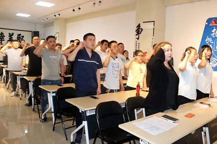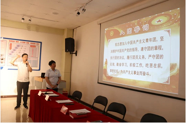 “我志愿加入中国共产主义青年团,坚决拥护中国共产党员的领导,遵守团的章程,执行团的决议,履行团员义务……”宋俊书记带领共青团员面对鲜艳的团旗进行庄严宣誓,再次重温入团誓词。