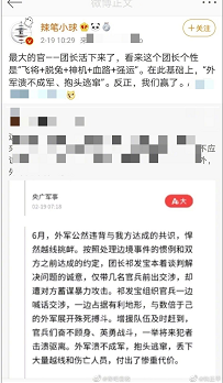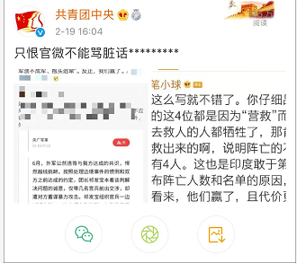 今年2月19日,拥有超250万粉丝的微博大V@蜡笔小球多次发表涉我边防官兵不当言论,内容令人发指,引发网友强烈指责,@共青团中央 更是直接点名,表示“只恨官微不能骂脏话”