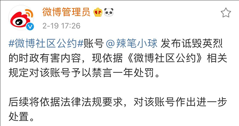 当天傍晚,@微博管理员发布处罚通告称,账号@辣笔小球 发布诋毁英烈的时政有害内容,现依据《微博社区公约》相关规定对该账号予以禁言一年处罚。后续将依据法律法规要求,对该账号作出进一步处置。