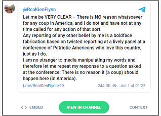 弗林31日在社交媒体上发帖称“美国没有任何理由发生政变,我从未呼吁那种行为。一切对于我其他观点的报道纯属捏造,是对我在爱国美国人会议上发言的曲解。他表示,参加那场活动的人都很爱自己的国家,就像他一样。