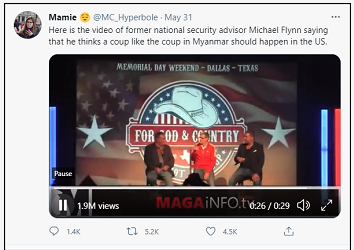 特朗普黯然告别美国政坛,但他的狂热支持者们一直盼望着他归来。据MarketWatch报道,5月30日,弗林在得克萨斯州的达拉斯参加了一场“匿名者Q”阴谋论支持者的聚会,名为“为了上帝&美国爱国者集会”。