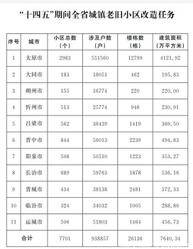 核心提示:近日,山西省政府办公厅印发《山西省城镇老旧小区改造攻坚行动方案(20212025年)》,《方案》提出,到十四五期末,基本完成7701个城镇老旧小区的改造任务。