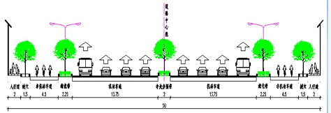 最小净空设计为机动车道≥4.5米,人行道、非机动车道≥2.5米;道路最大纵坡为6%(部分路段按非机动车推行考虑)。道路中间2米宽中央绿化分隔带,两侧各13.75米宽机动车道(双向8车道),2.25米宽绿化分隔带,4.5米宽独立非机动车道,3.5米宽人行道。