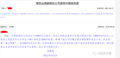 不过,山西省发改委已不止一次澄清与山西能源总公司“无关”,且在多次回复“无果”后,再次于2021年4月份的一则回复中详细解释了曾与其发生的“交集”:“山西能源总公司成立于1988年7月16日,成立之初的主管单位为原山西省计委。1990年6月11日,山西省人民政府办公厅作出(90)晋政办函66号批复,明确“该公司归属山西吕梁能源开发总公司,自主经营,独立核算”。自1990年6月11日起,山西能源总公司与山西发改委已经不存在任何实际法律关系。通过国家企业信息信用公示系统平台查询,该公司与我委无关”。