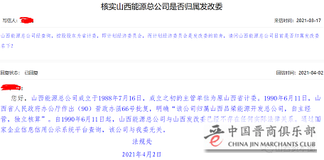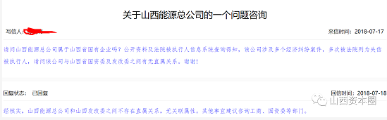 但之后关于山西能源总公司的归属问题似乎并没有得以进一步明确,这从山西能源总公司和山西省发改委关于其归属回应亦可以看出端倪:山西能源总公司表示,1988年山西省计委组建公司时,对公司实行计划单列,并提供流动资金两千万元,其至今仍是公司实际出资的唯一股东(山西省计委后已于2003 年改组为山西省发改委),而其又提及山西省发改委曾于2018年7月在官网《关于山西能源总公司的一个问题咨询》中的回复,山西能源总公司和省发改委之间不存在直属关系,无关联属性,所以山西能源总公司认为省发改委为公司唯一股东,但其与公司不存在隶属关系。