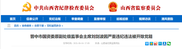 日前,晋中市纪委监委对晋中市国资委原副处级监事会主席刘剑波严重违纪违法问题进行了立案审查调查。