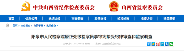 阳泉市人民检察院原正处级检察员李锦宪涉嫌严重违纪违法,目前正接受阳泉市纪委监委纪律审查和监察调查。