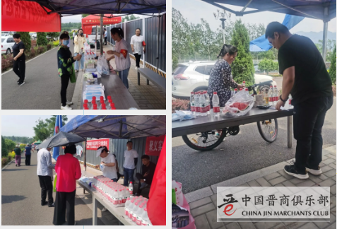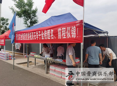 集团志愿者为保证考场周边的秩序的执法人员送去矿泉水,让他们在炎热的夏天感受到一丝清凉。