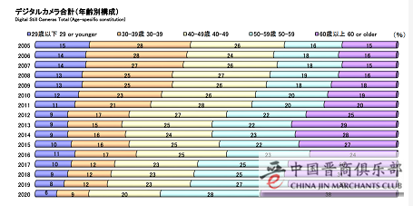 从购买者年龄构成来看,数码相机的购买人群大部分集中在30岁以上,年龄在29岁以下的购买者到了2020年已不足6%,而60岁以上的购买者比重则是扩大到38%。