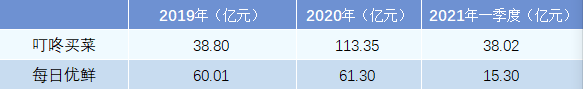 营收规模来看,叮咚买菜招股书显示,其2019年和2020年营收分别达到38.80亿元和113.35亿元,2021年一季度则为38.02亿元;而每日优鲜2019年和2020年营收则分别为60.01亿元和61.30亿元,2021年一季度则为15.30亿元。在这一方面,叮咚买菜可谓完胜,其营收在2020年取得爆发式增长,大举反超每日优鲜,且这一优势在2021年仍在继续。