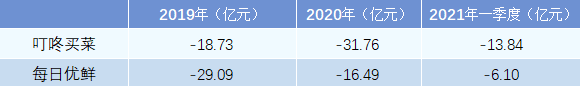 再来看看利润方面,二者均是处于净亏损状态,可谓半斤八两。叮咚买菜招股书显示,其2019年和2020年净亏损分别达到18.73亿元和31.76亿元,2021年一季度则净亏损13.84亿元;每日优鲜2019年和2020年净亏损分别达到29.09亿元和16.49亿元,2021年一季度则净亏损6.10亿元。