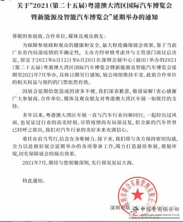 根据官方此前的信息,原定于2021年6月12日至6月20日在深圳会展中心(福田)举办的2021(第二十五届)粤港澳大湾区国际汽车博览会暨新能源及智能汽车博览会延期至2021年7月举办,具体日期另行通知,展会场馆维持不变。此前合作单位的相关权益与预约的门票依然有效。