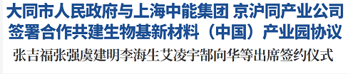 6月11日上午,大同市人民政府与上海中能集团、山西京沪同产业公司合作共建生物基新材料(中国)产业园签约仪式举行,这是我市深入贯彻落实习近平总书记视察山西重要讲话重要指示,按照省委、省政府部署要求,加快培育新兴产业未来产业、全力推动高质量转型发展的务实举措和具体行动,也是近年来我市招引的重要优势转型项目。