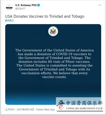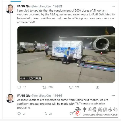 而就在美国宣布捐赠80瓶辉瑞的今天,方遒大使也发推称,特多政府订购的20万剂国药疫苗正在运往西班牙港机场,“很高兴明天受邀在机场迎接第二批国药疫苗”。同时,方遒大使还透露,下个月将有更多的中国新冠疫苗抵达特多,相信特多的大规模疫苗接种计划将取得更大的进展。