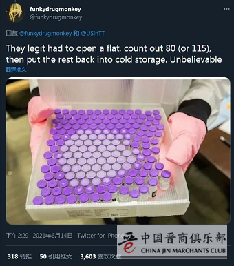 这条推特下有很多人嘲笑美国使馆,其中一条评论亮了:“他们真的打开了一盒(疫苗),从里面数出80(或115)瓶疫苗,再把剩下的扔回冷藏库。真是难以置信。”
