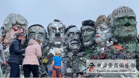 用废弃电子产品制作的垃圾版“总统山”矗立在七国集团峰会举办地附近。视频截图