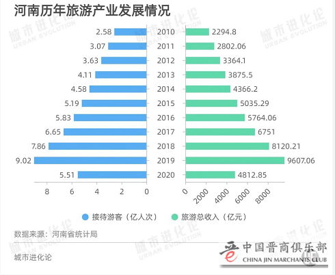 过去十年间,河南接待游客量从2010年的2.58亿人次一路上涨、连跨台阶,2019年达到9.02亿人次,这一年,旅游总收入也达到峰值9607.06亿元。